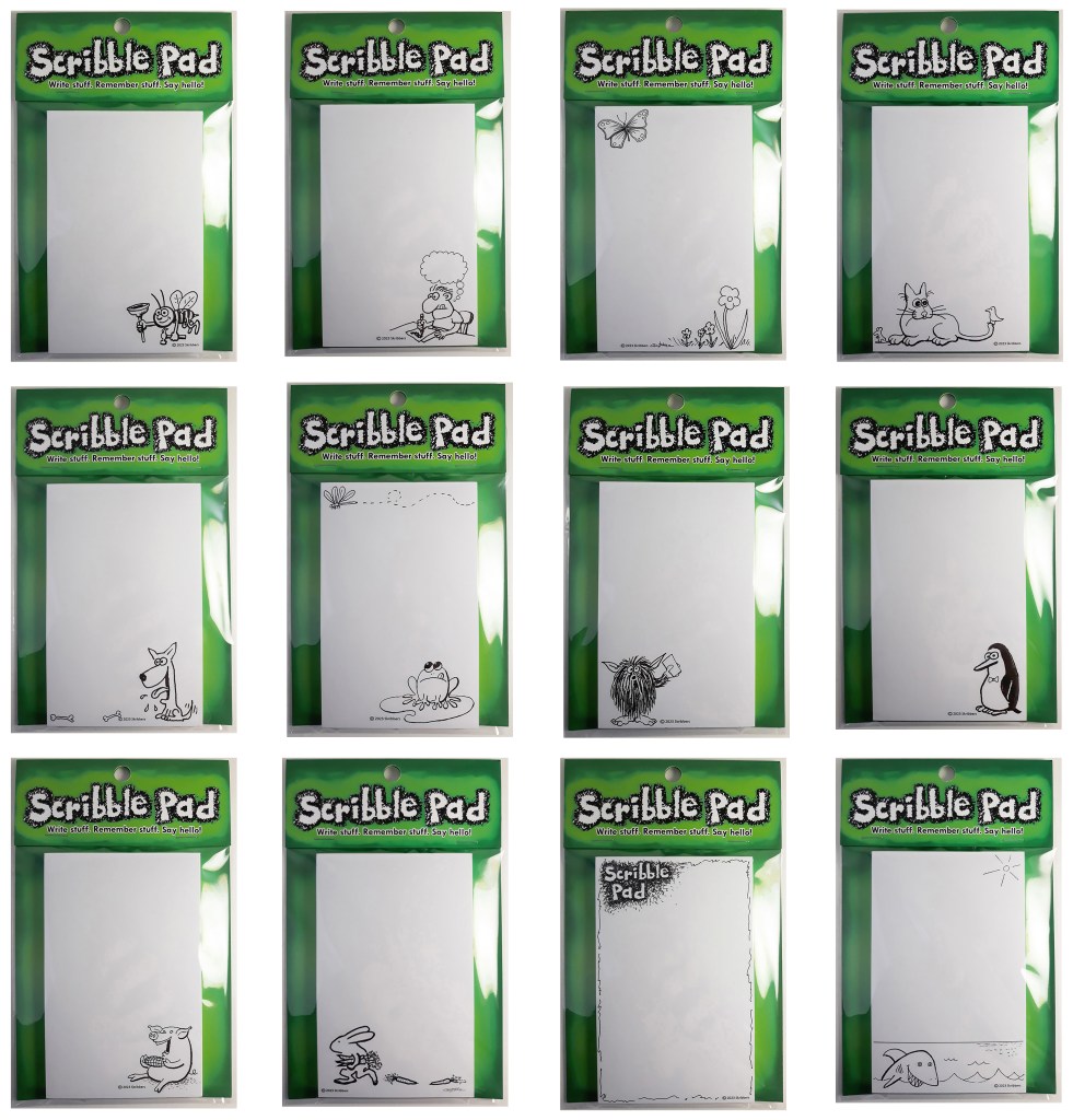While working at a small print shop, I often printed a certain job that produced tiny, blank notepads as a residual by-product. They were then put on the front counter and given away to anybody who wanted them. I got permission to put a design on the pads and sell them. People bought them, so I made more and more designs until I reached the twelve that you see here today. This was the genesis of the ScribblePad. The ScribblePad is a novelty notepad that is 3.5 inches wide by 5.5 inches tall. It is printed on recycled 50# white bond paper to help preserve our trees. Each pad has 50 sheets and a chipboard backer and is glued at the top. The packaging and pads were printed at Foresight Group in Lansing, Michigan, USA.